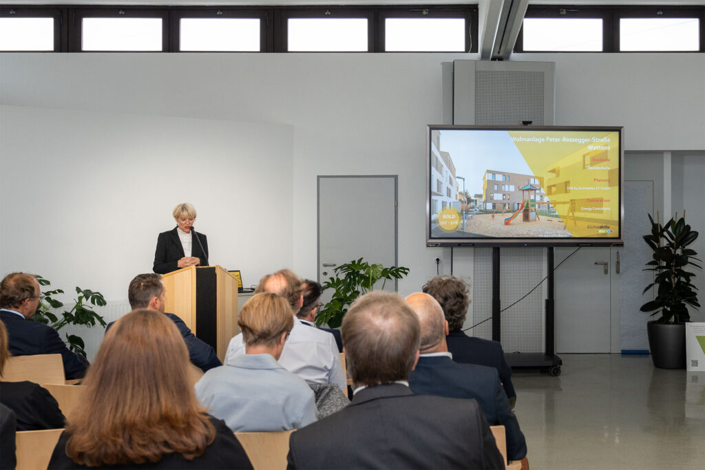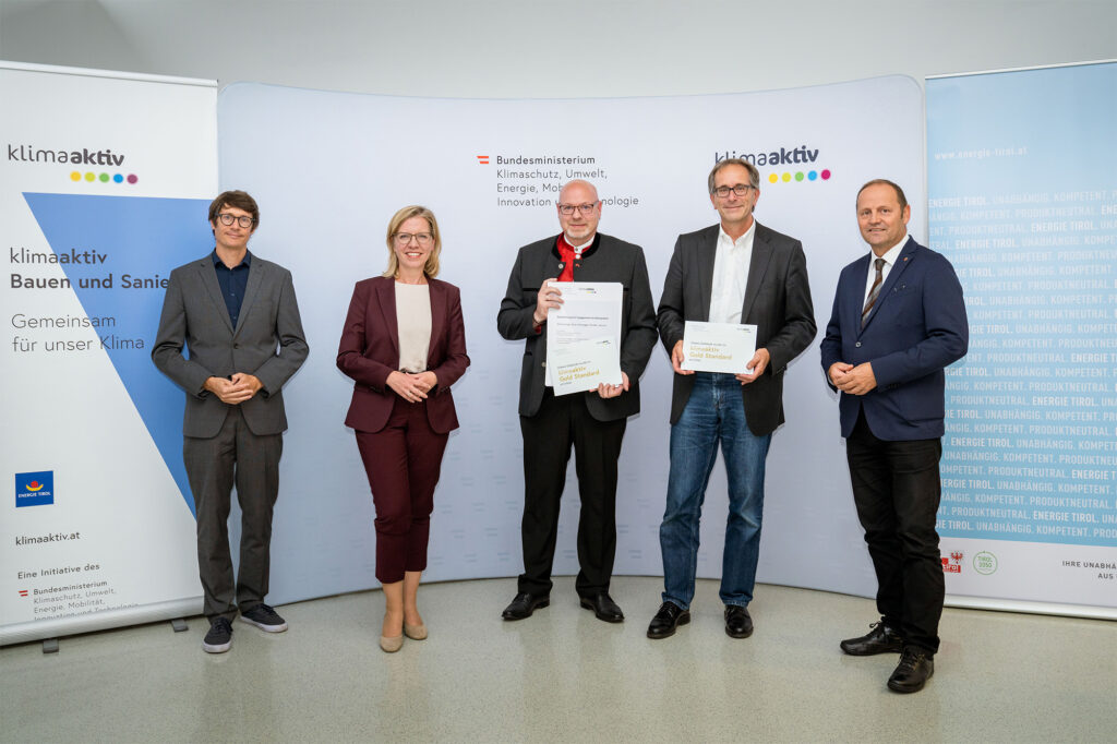 „Klimaaktiv Bauen und Sanieren“ ist eine Initiative des Klimaschutzministeriums. Seit 2004 wurden in Österreich über 1.120 Gebäude nach den Kriterien des klimaaktiv Gebäudestandards bewertet und deklariert. Etwa ein Drittel aller bislang deklarierten Gebäude kommen aus Tirol, wie Landeshauptmann-Stellvertreter Josef Geisler in seiner Ansprache hervorhob. Bei der diesjährigen Verleihung werden 35 Projekte mit „Gold“ ausgezeichnet, die in den Jahren 2020 und 2021 fertiggestellt wurden. Mehr als die Hälfte dieser höchst-prämierten Gebäude hat die Alpenländische errichtet.