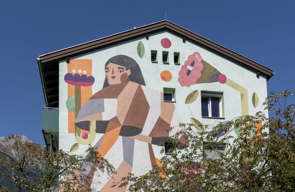 Ein besonderes Highlight war 2025 die großflächige Wandgestaltung in der Frau-Hitt-Straße 3f, wo die Wiener Künstlerin Frau Isa eine Fassade in ein beeindruckendes Kunstwerk verwandelte. Ihre Arbeit greift die Tiroler Sage rund um Frau Hitt auf und verbindet Tradition mit moderner Formensprache. Entstanden ist die Malerei im öffentlichen Raum – Passantinnen und Passanten konnten der Künstlerin beim Arbeiten zusehen und so den Entstehungsprozess miterleben.