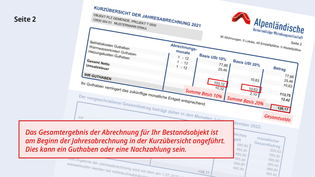 Das Ergebnis der Abrechnung, also das Guthaben oder die Nachzahlung finden Sie auf der zweiten Seite, also der Rückseite der ersten Seite, der Abrechnung.