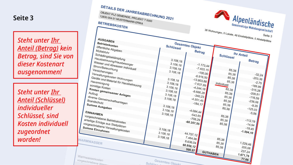 Betriebskosten: Hier werden die einzelnen Kostenarten aufgegliedert und der Betrag für Ihre Einheit ermittelt!