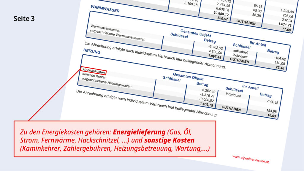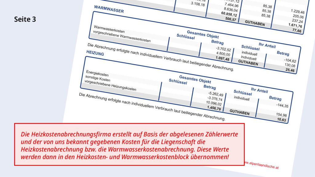 Die Heiz- und Warmwasserkosten werden dem Eigentümer zum jeweiligen Nutzungszeitraum verrechnet.