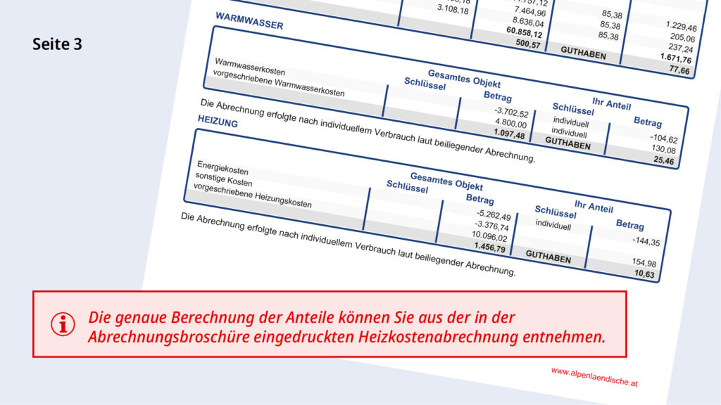 Der Saldo aus der Jahresabrechnung wird zusammen mit der Monatsvorschreibung im zweifolgenden Monat verrechnet! z.B.: Bei Zustellung der Abrechnung im Mai ist die Fälligkeit mit Juli gegeben.