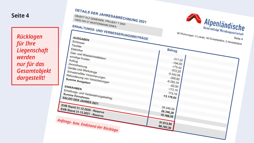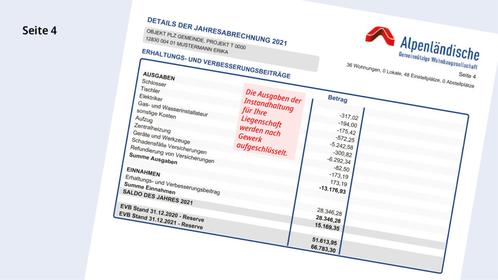 Die Instandhaltungsübersicht weist den Gesamtbetrag der Wohnanlage bzw. der jeweiligen wirtschaftlichen Einheit aus.