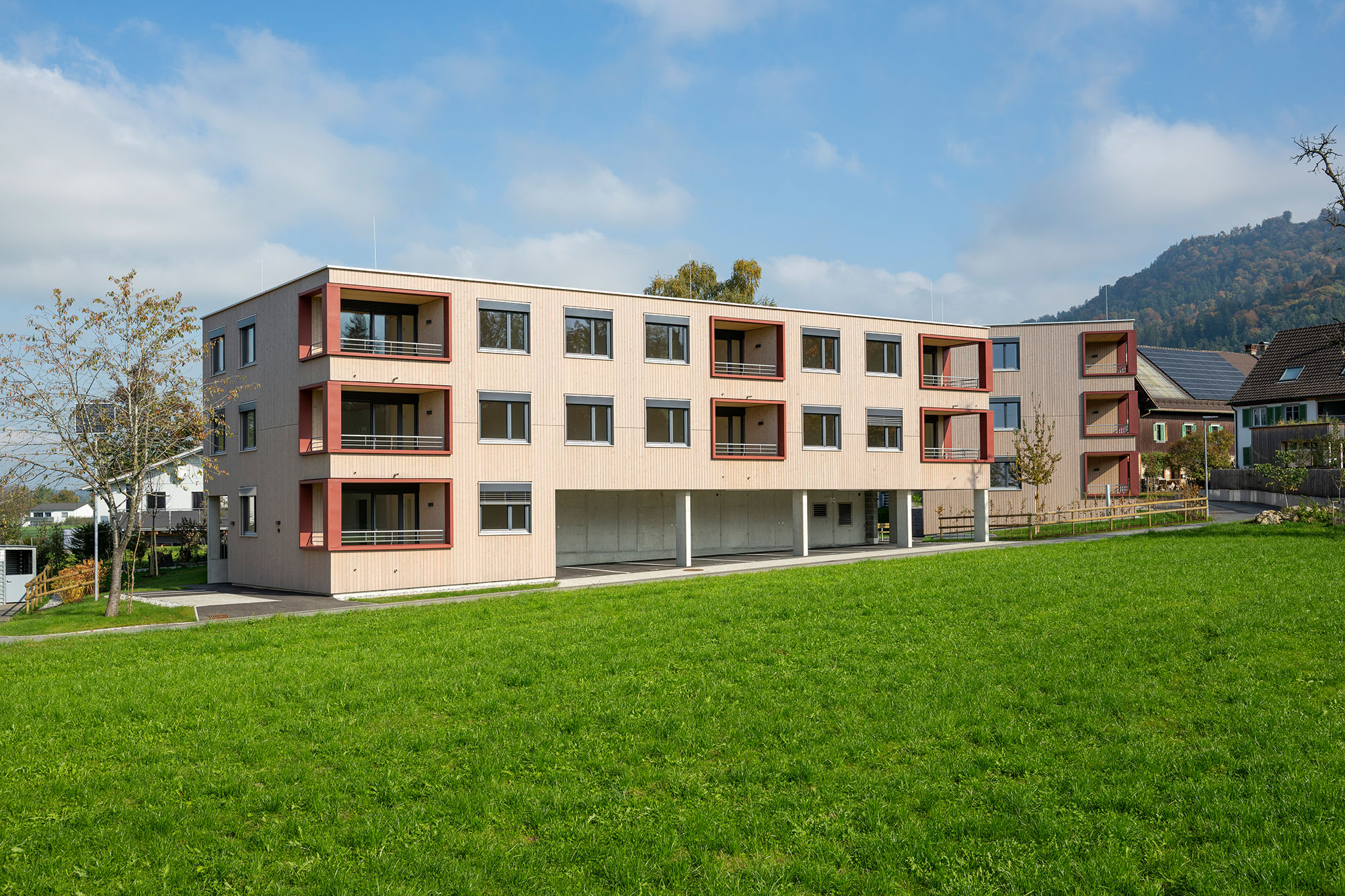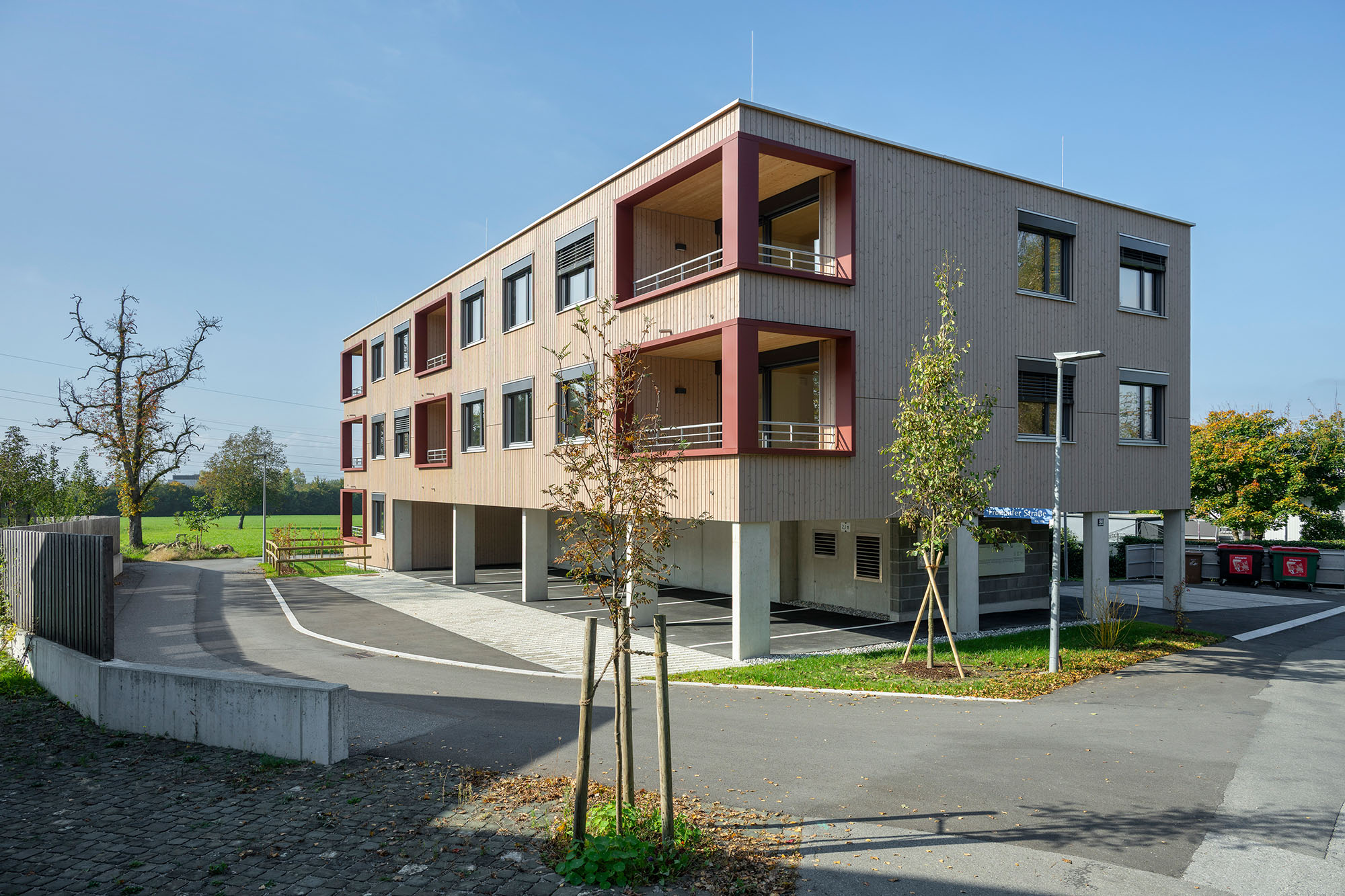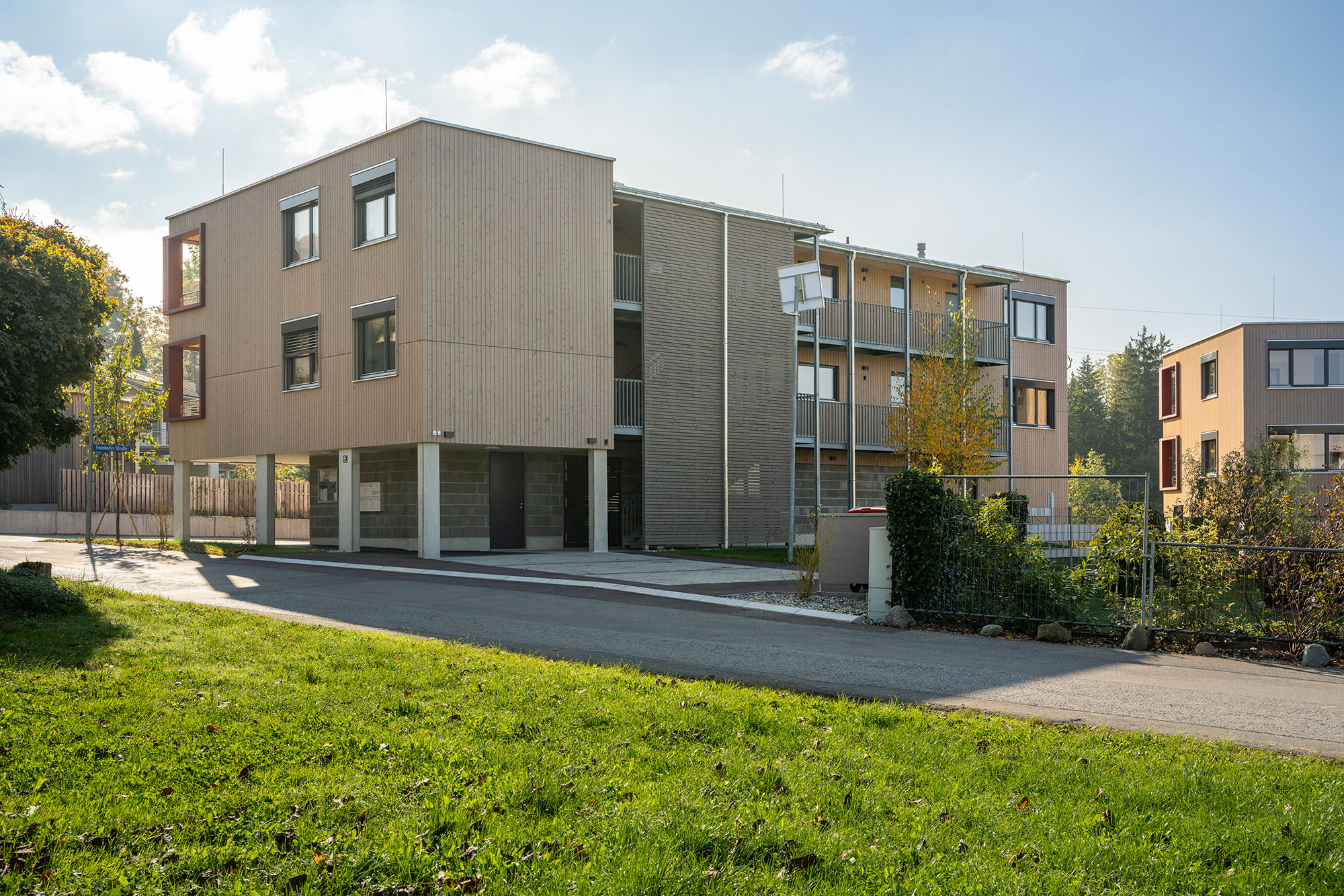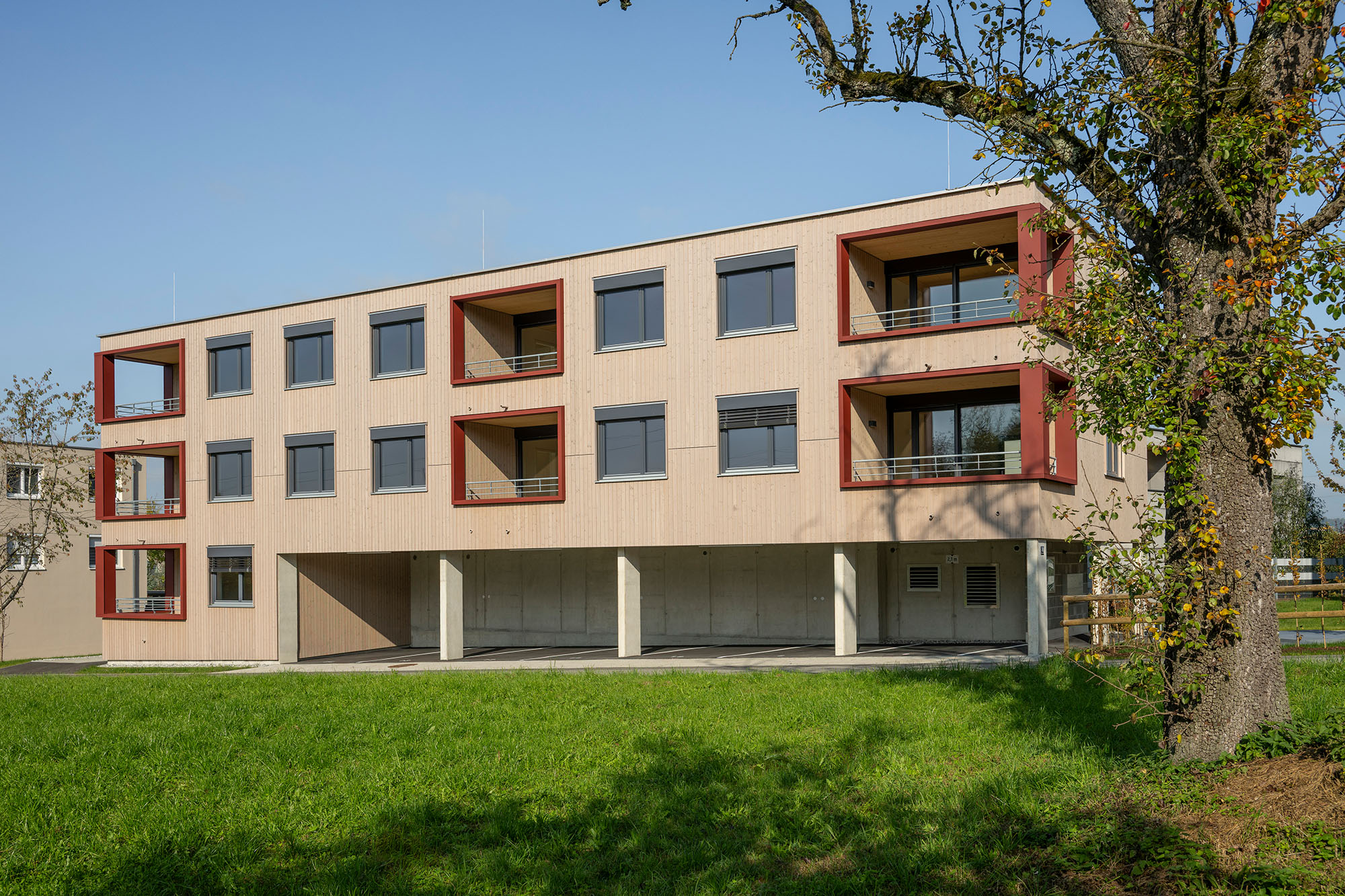 Eine Wohnanlage mit insgesamt 14 Mietwohnungen und 14 überdachten KFZ-Einstellplätzen, bestehend aus 2 Baukörpern, welche jeweils durch ein Stiegenhaus erschlossen werden. Die Technik- und Kellerräume werden im Massivbau ausgeführt mit Stahlbetondecken. Das Tragwerk der Wohnungen besteht aus Holzriegelwänden mit Massivholzdecken. Jede Wohnung verfügt über einen Balkon. Außerdem sind jeder Wohnungseinheit ein überdachter Carportplatz sowie ein Kellerabteil zugeordnet