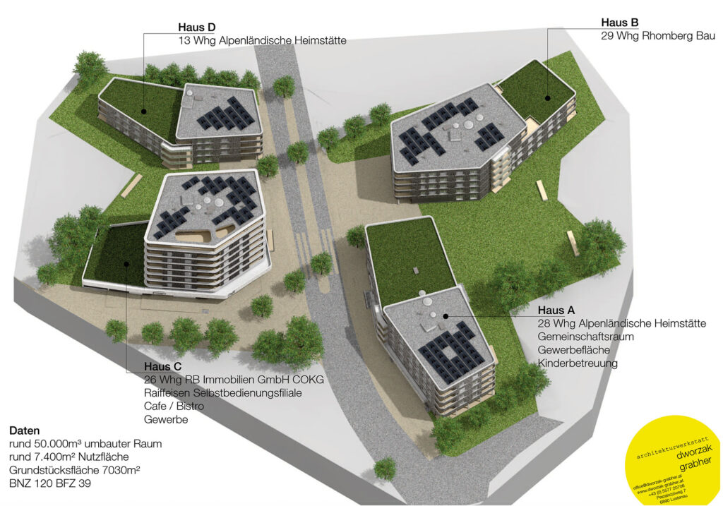 Die Alpenländische errichtet in der ersten Bauetappe „West“ eine vierstöckige Wohnanlage mit 13 geförderten Mietwohnungen, 13 Tiefgarageneinstellplätze und einem Autoabstellplatz im Freien. Es handelt sich dabei um ein mehrgeschossiges, unterkellertes Bauvorhaben, das E+3 Geschoße mit einem Baukörper in Stahlbetonskelettbau mit Stahlbetonstützen und Holzaußenwänden umfasst.